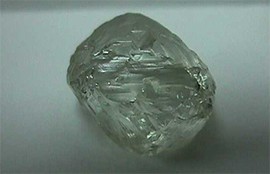 The rough diamond weighs 20.09ct. and was purchased in West Africa. The shape is octahedral with rounded points and ribs. A large feather inclusion is situated on one of the faces that extend from the surface to approximately one third into the diamond. The rough diamond will be oriented so that a large clean piece can be obtained and the smaller piece positioned to minimize the large feather inclusion.