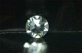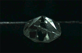Shown, is an aerial view of the fully blocked 12.23ct. rough diamond. A blocked diamond is one in which all eight crown mains (facets) including the table is fully cut and polished. The pavilion has eight corresponding mains (facets) and one culet. The diamond is now ready for the remaining facets, which is called the brillianteering process. There are a total of 58 facets to a full cut round brilliant.