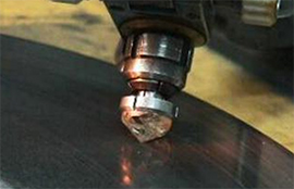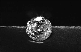 The diamond is mounted in a sawing machine and lowered into a revolving blade that spins at approximately 8,500 RPM. The edge of the blade is coated with diamond powder and periodically charged during the sawing process. It took approximately 21 hours to saw through the entire 20.09ct. rough.